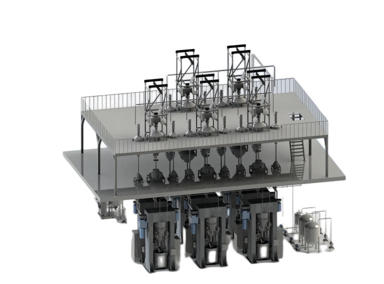 浆料制备系统应用于锂离子电池正负极浆料制备工艺中,完成原料自动供料、浆料预储及上料的专用系统。系统主要由粉体上料系统、液体上料系统、真空搅拌机、浆料储搅上料系统等部分组成。